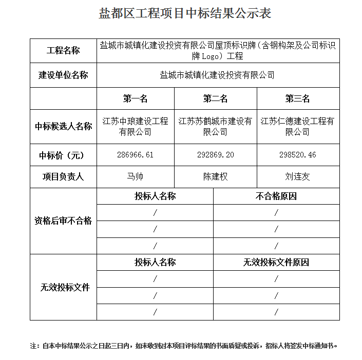 上一篇:鹽城市城鎮(zhèn)化建設投資有限公司屋頂標識牌(含鋼構(gòu)架及公司標示牌Logo)工程中標公示